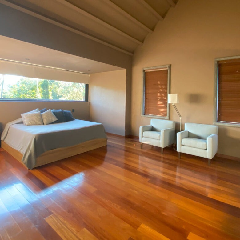 En el segundo nivel, de 159m2, con un puente de madera que dirige a 2 habitaciones con sus baños independientes y el cuarto principal con un walk in closet y baño.